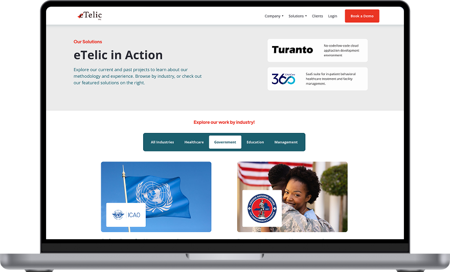 With my previous job experiences, I had developed a good understanding of webflow and wordpress. I pitched both design platforms to our team, and we decided on Webflow. From here, I sat with our founder and ceo and explored different themes, tones, color ways, and overall "vibes" we may want to use in our new web design. We settled on professional but approachable, since a lot of our clients were in government. I took some time to create a color palette for the company and develop a rudimentary branding guide. Using these, I set out to overhaul the entire website. We decided to employ CMS to organize our projects, as we had a lot of different projects across various industries. eTelic uses its in-house software, Turanto, to create all of our sub-softwares for our clients, so it was important to keep that at the forefront of the website.